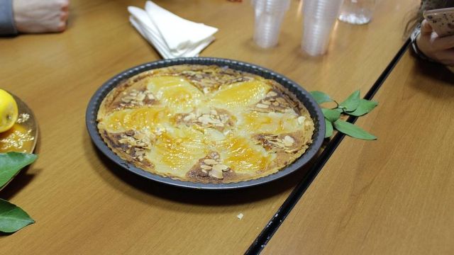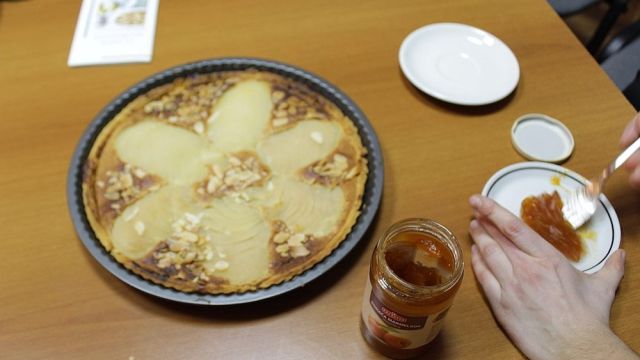 Počeli smo prvo sa izradom tijesta, koje smo potom prekrili kremom od badema i rezanim kruškama. Na kraju, naš lijepi tart posuli smo listićima badema, a potom, još topao, tart premazali džemom da zablješti.