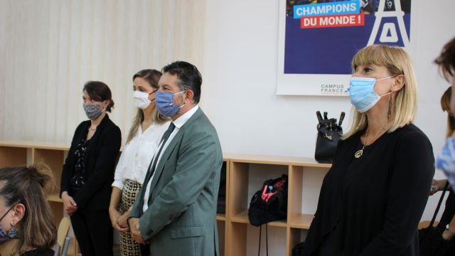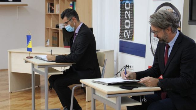 Guillaume Rousson, Ambassadeur de France en Bosnie-Herzégovine, M. Anis KRIVIĆ, Ministre de l’éducation du Canton de Sarajevo, et M. Benjamin HEDŽIĆ, Directeur du lycée Obala, ont signé le 25 août 2020 une convention de coopération tripartite au lycée Obala.