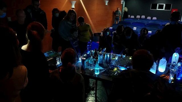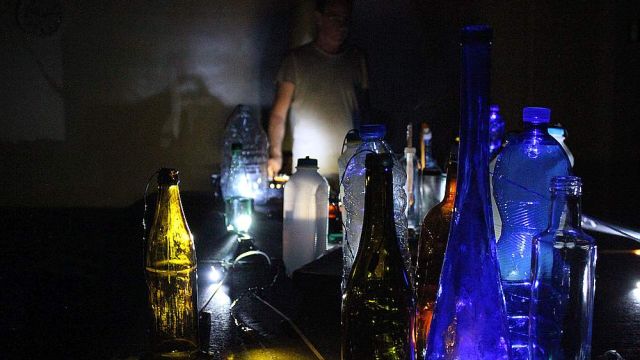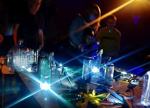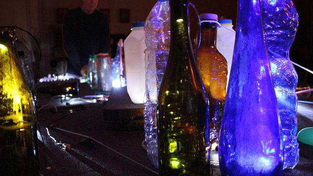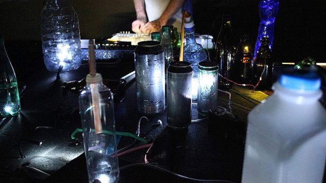 Des bouteilles, des canettes, des baudruches, des tuyaux. Un compresseur, des micros. Un poste de contrôle avec 24 petits robinets en guise de potentiomètres.