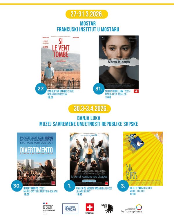Dans le cadre des Journées de la Francophonie, la Semaine du film francophone, organisée du 25 mars au 8 avril, a proposé une programmation cinématographique riche et variée dans plusieurs villes de Bosnie-Herzégovine. Cette semaine a été l’occasion de faire découvrir au public la diversité du cinéma francophone contemporain, à travers des films abordant des thèmes forts tels que le corps, l’émancipation, la justice, la mémoire, l’enfance et l’imaginaire.