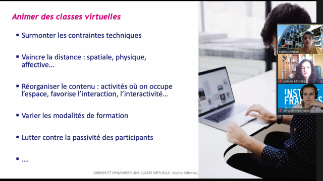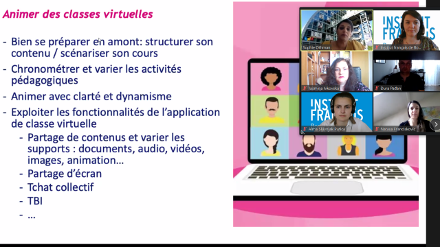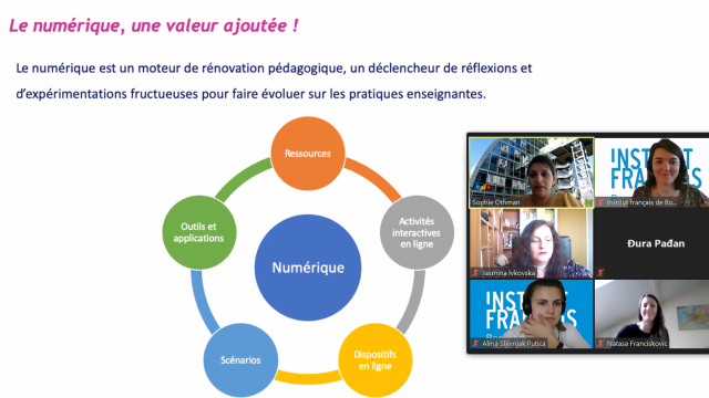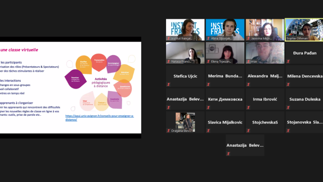 Animé par Mme Lucile Bertaux, attachée de coopération pour le français auprès de l’Ambassade de France et directrice des cours à l’Institut français de Bosnie-Herzégovine, le webinaire a permis aux professeurs d’échanger sur leurs pratiques pédagogiques.