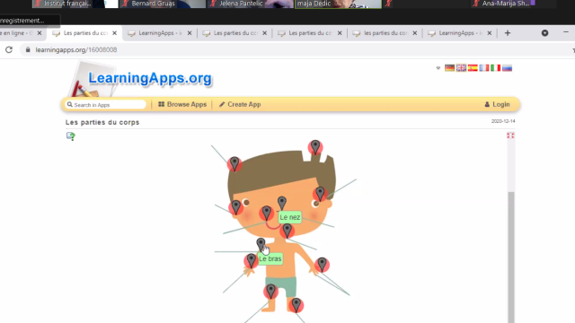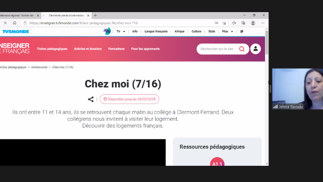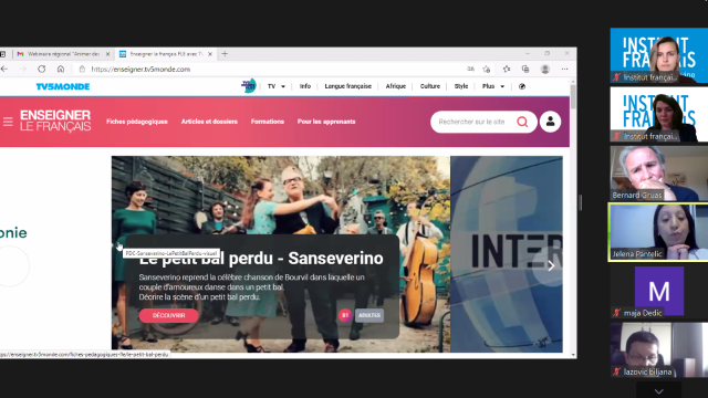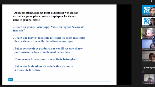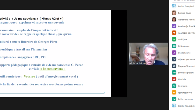 Animé par Lucile Bertaux, Attachée de coopération pour le français auprès de l’Ambassa de de France et Directrice des cours à l’Institut français de Bosnie-Herzégovine, le webinaire a permis aux professeurs d’échanges sur leurs pratiques pédagogiques. Bernard Gruas, formateur expérimenté a présenté les principes de la pédagogie de projet pour enseigner le français en ligne. Les professeurs de Bosnie-Herzégovine, Macédoine du Nord et Serbie ont partagé leur expérience de cours en ligne.