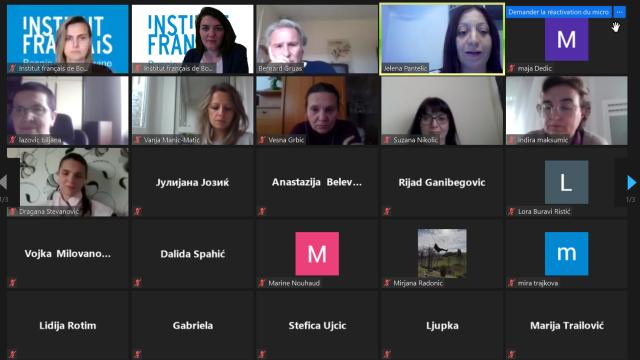 Le mercredi 28 avril de 14h30 à 18h00, l’Institut français de Bosnie-Herzégovine, en partenariat avec l’Institut français de Serbie et de Skopje, a organisé un webinaire régional pour 100 professeurs de français de Bosnie-Herzégovine, Serbie et Macédoine du Nord. Les professeurs ont échangé sur leurs expériences de cours en ligne et ont découvert des astuces et ressources pédagogiques pour motiver les élèves de collèges – lycées à apprendre le français.